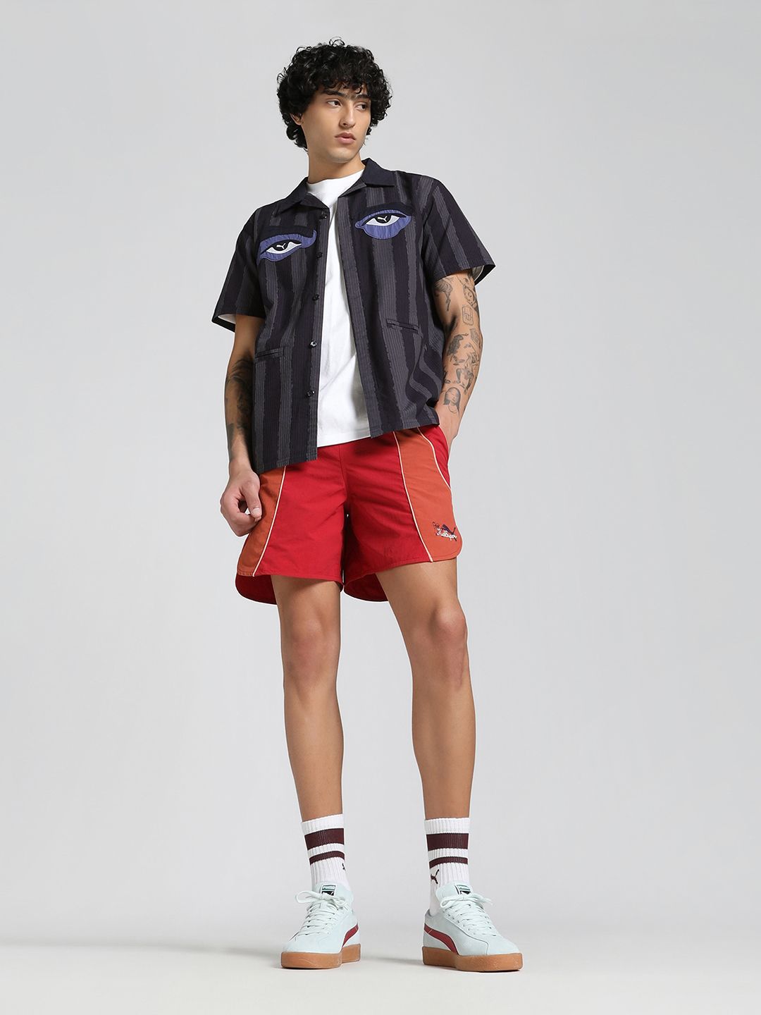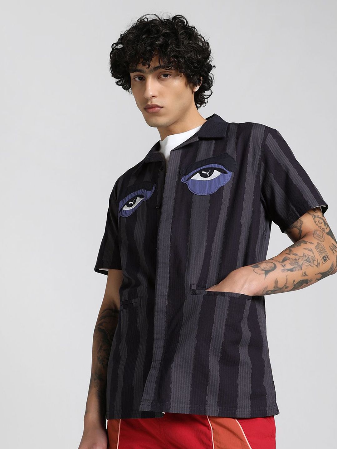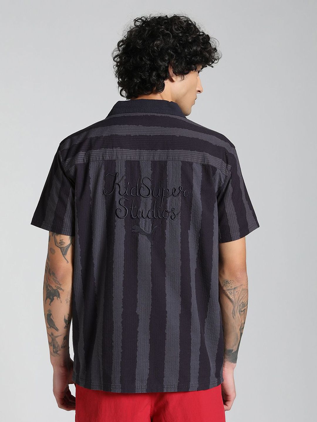 The latest PUMA x KIDSUPER collection is here. This seasons designs capture Colm Dillanes playful and eclectic spirit, with graphics inspired by his handwriting and vibrant, distinctive artwork. Pulling inspiration from the football world, pieces include a new take on the King Indoor sneaker, as well as football jerseys, shorts, and trousers. Part of the collection, this shirt has shirt sleeves and a comfortable, relaxed fit