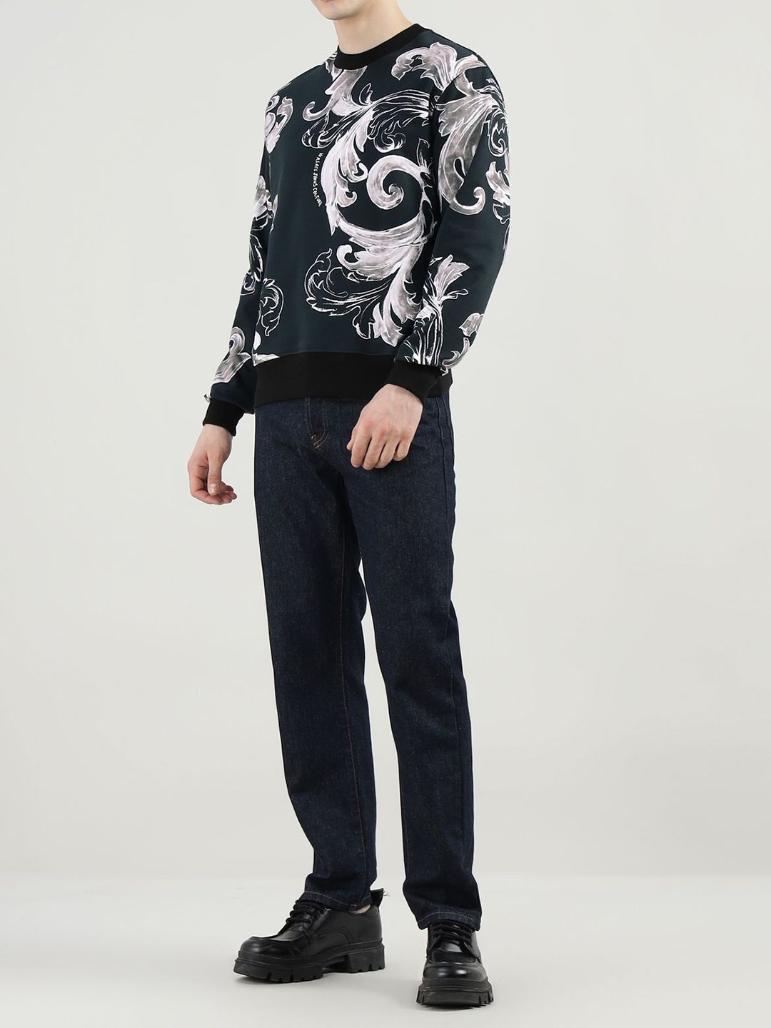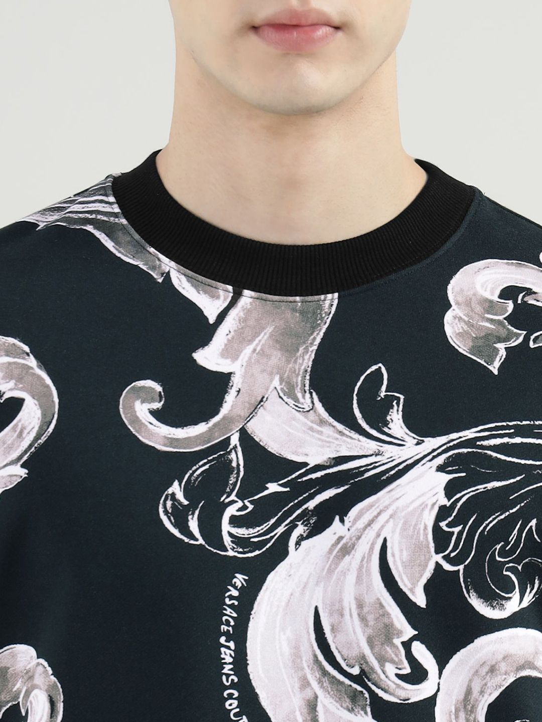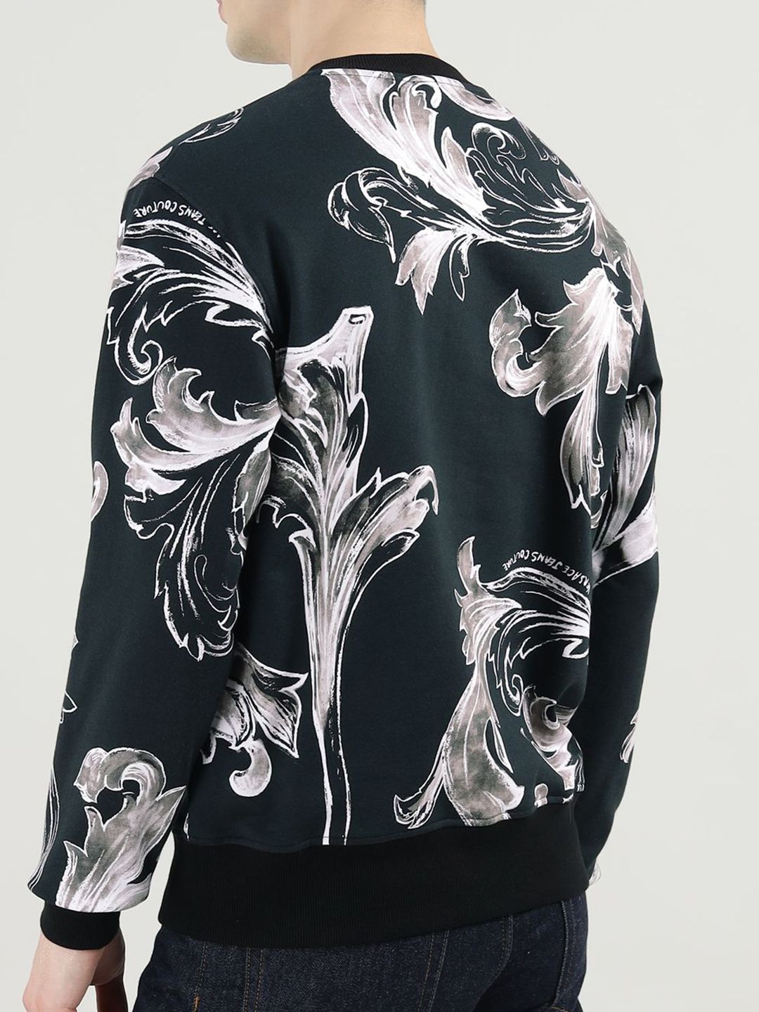 Black printed sweatshirt has a round neck, na pockets, long sleeves, closure, straight hem