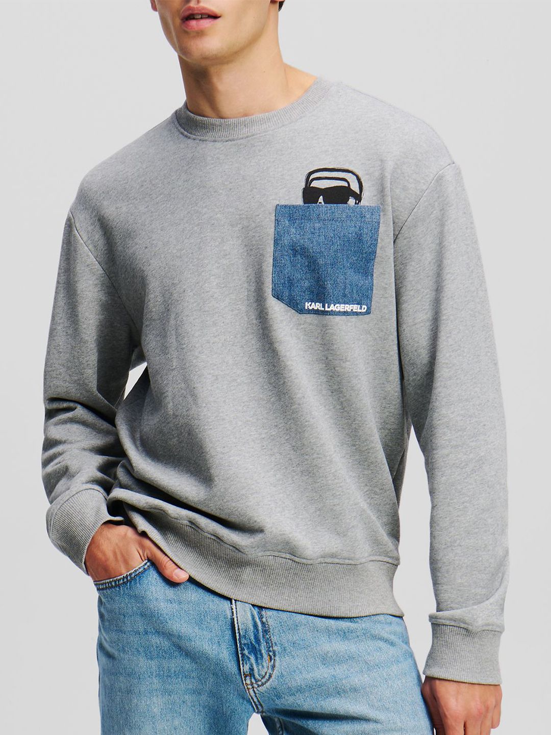 Grey solid sweatshirt has a round neck, 1 pockets, long sleeves, closure, straight hem
