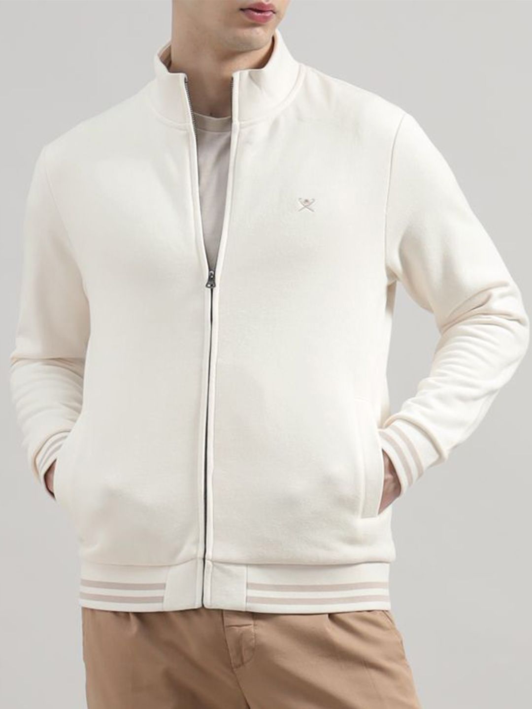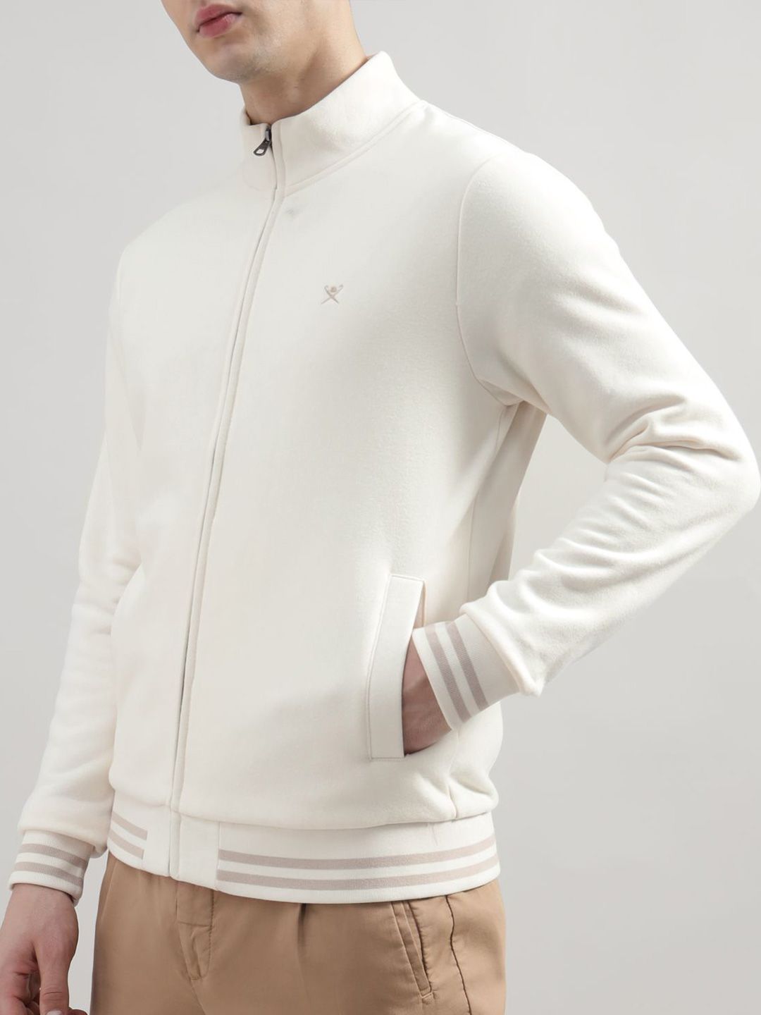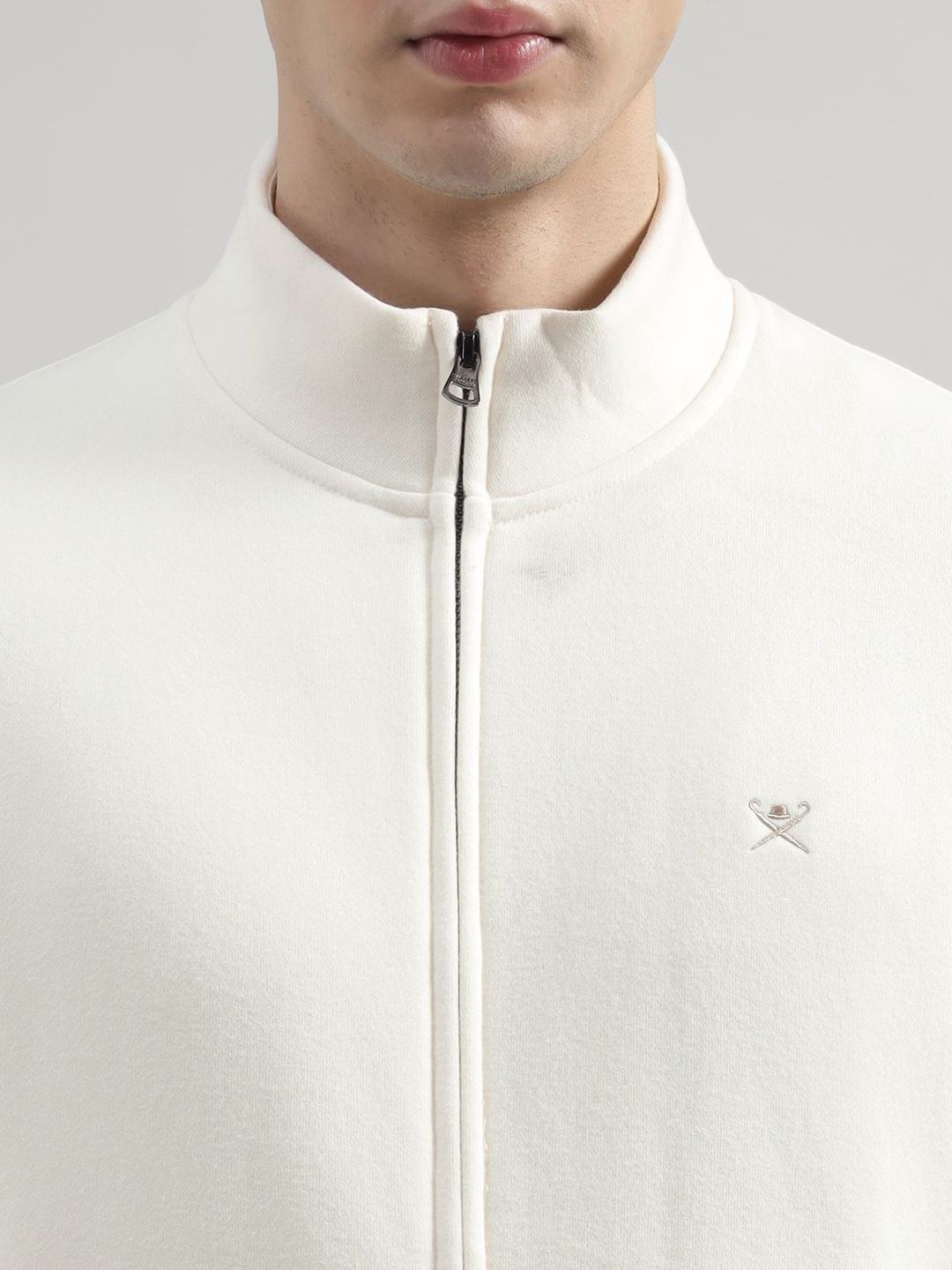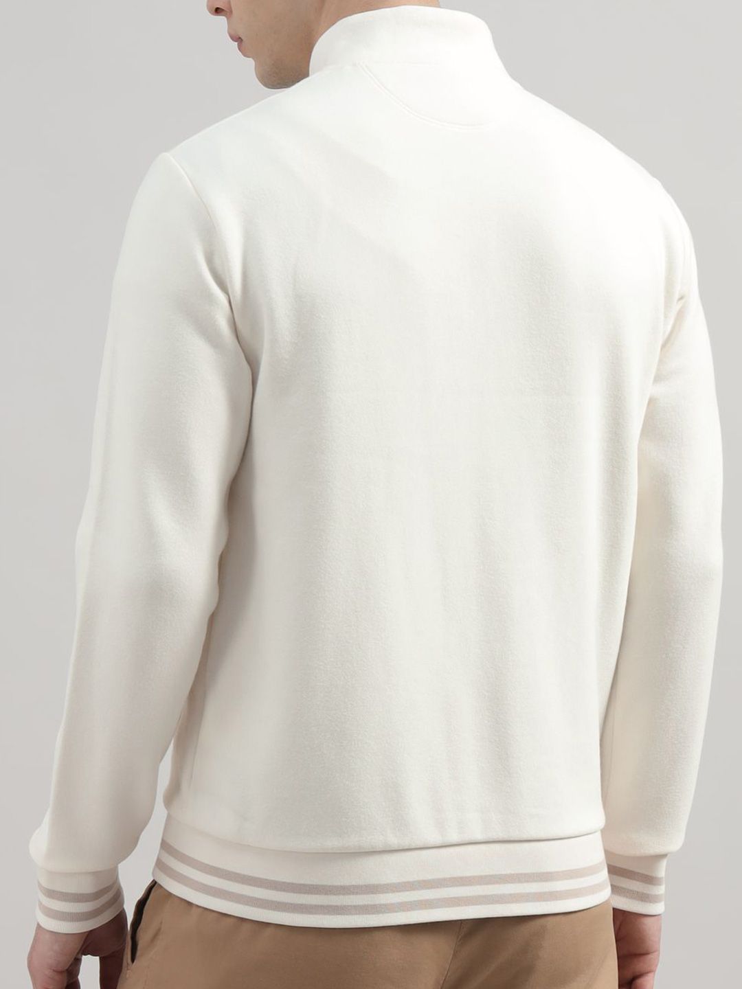Off white solid sweatshirt has a turtle neck, na pockets, long sleeves, zip closure, straight hem