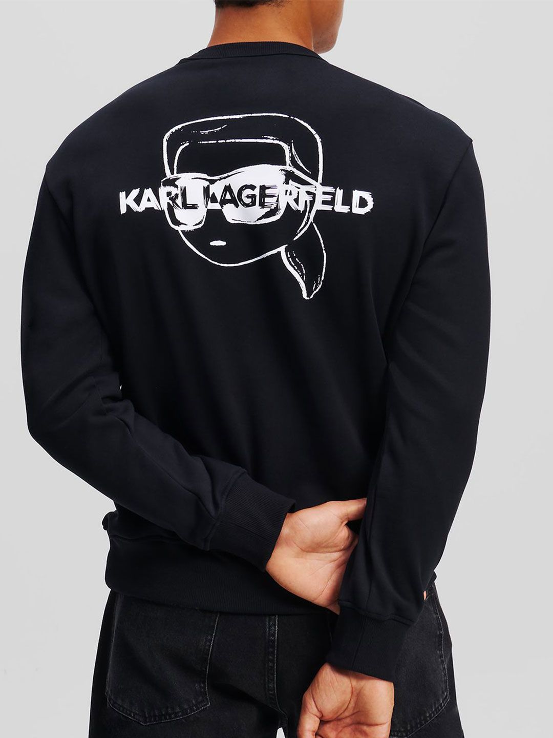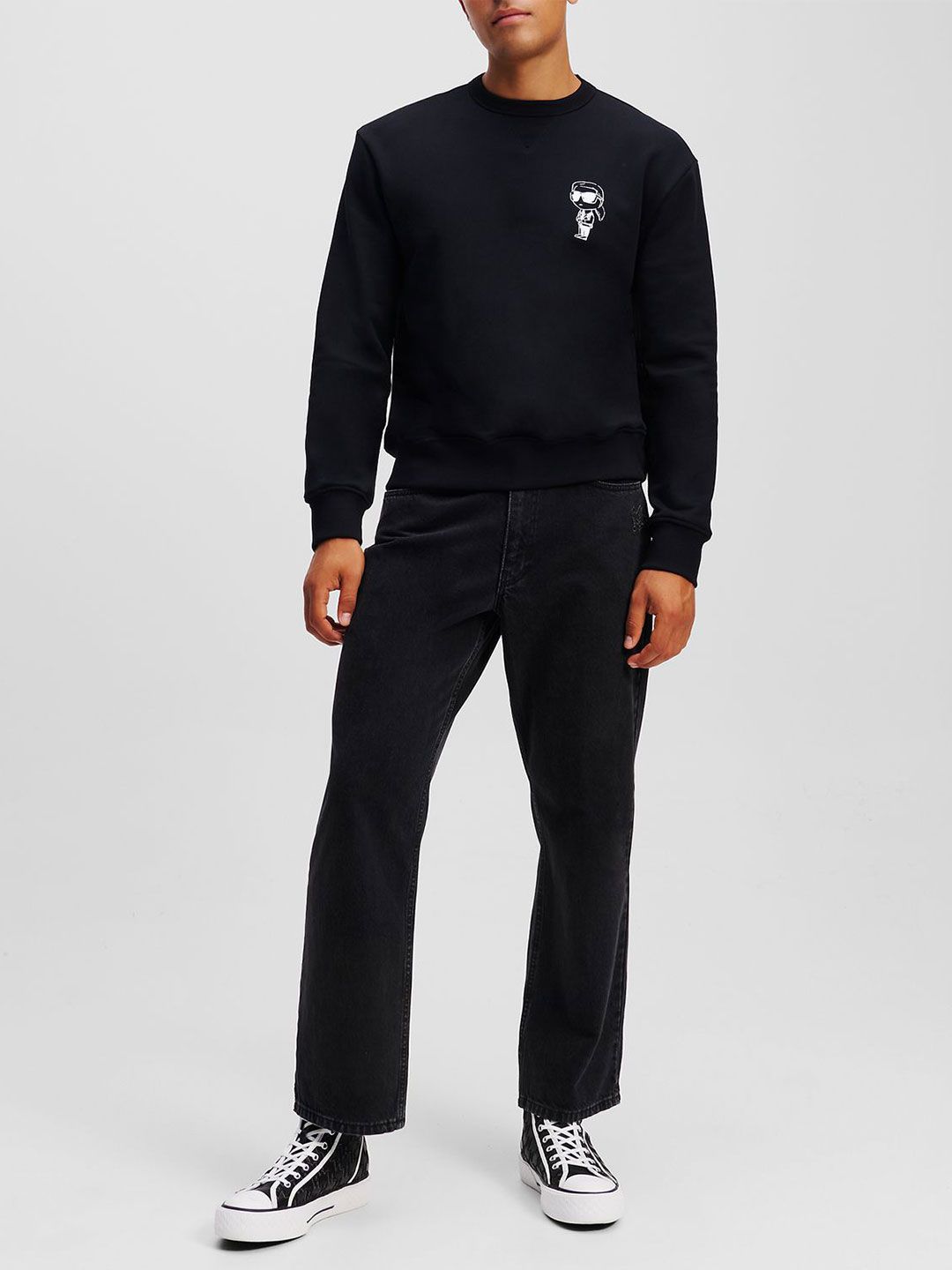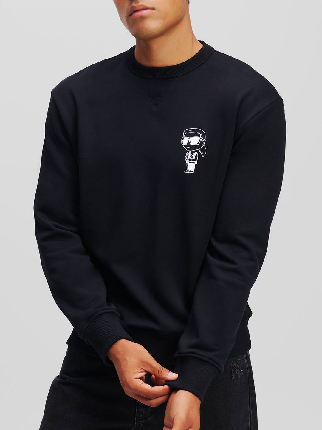 Black solid sweatshirt has a round neck, na pockets, long sleeves, closure, straight hem