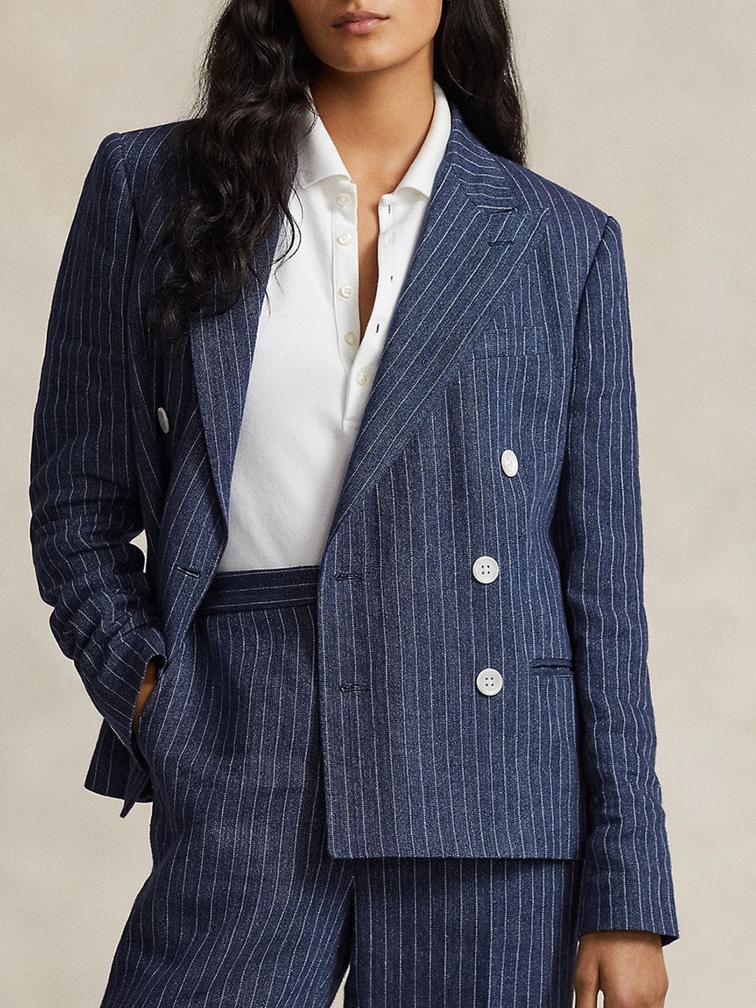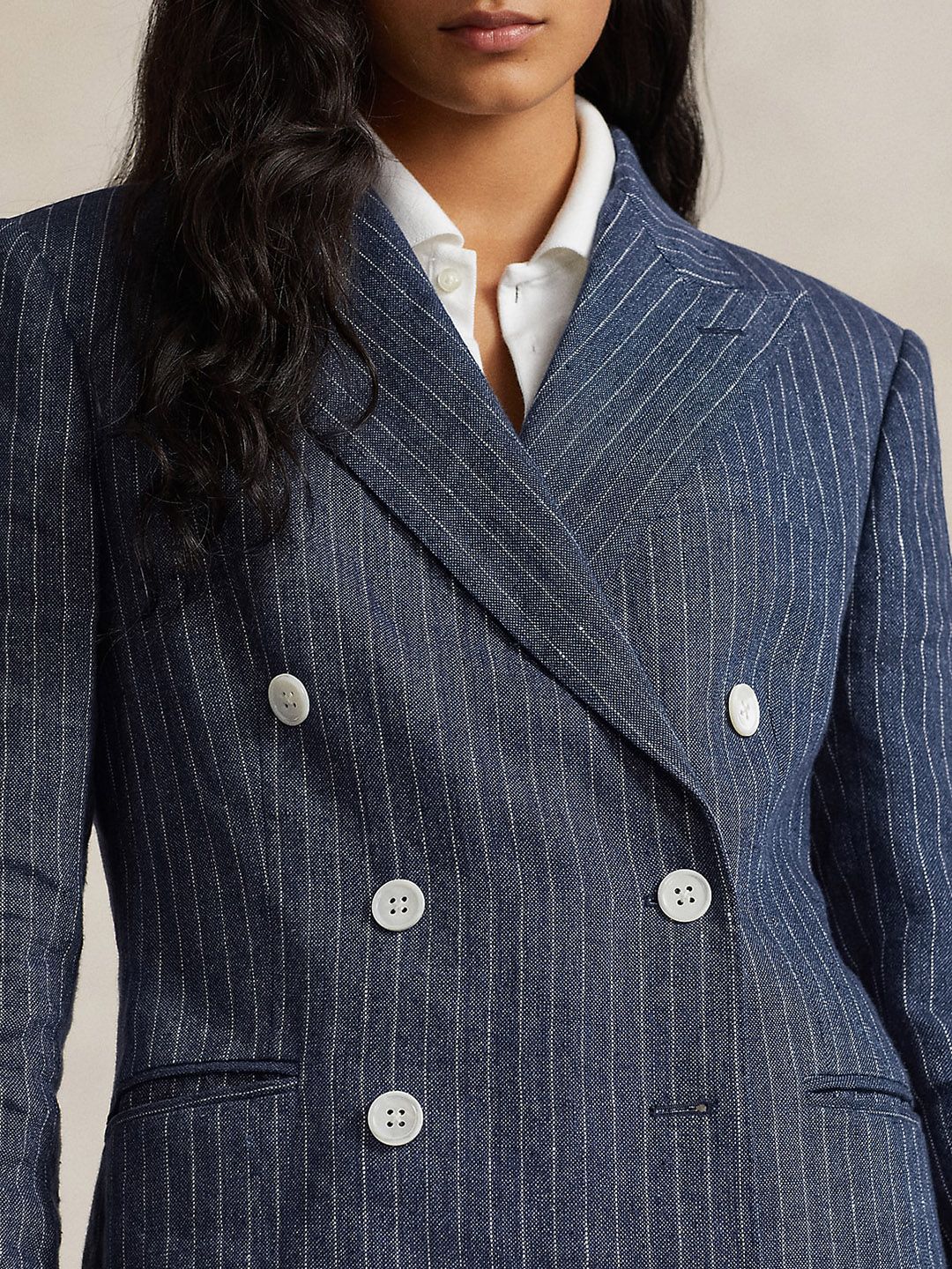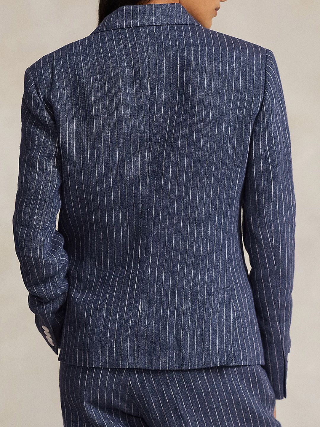 Navy blue striped slim-fit casual blazer, has a notched lapel, long sleeves, double-breasted with button closure, two flap pockets, one welt pocket and a double-vented back hem